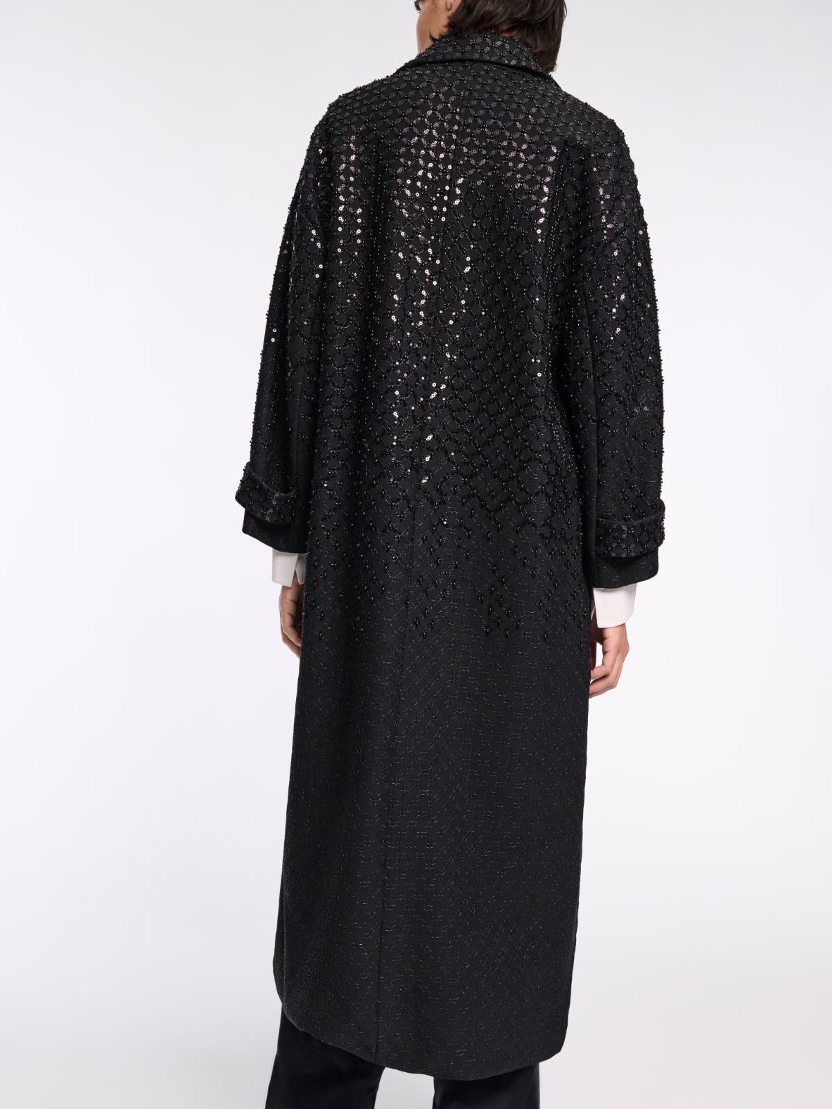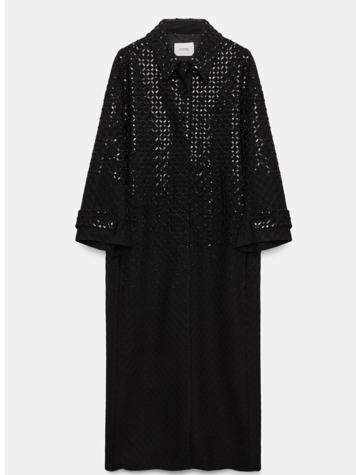 This elegant Dorothee Schumacher coat combines premium Punto Milano fabric with intricate floral sequin detailing, creating a luminous piece designed for special occasions.