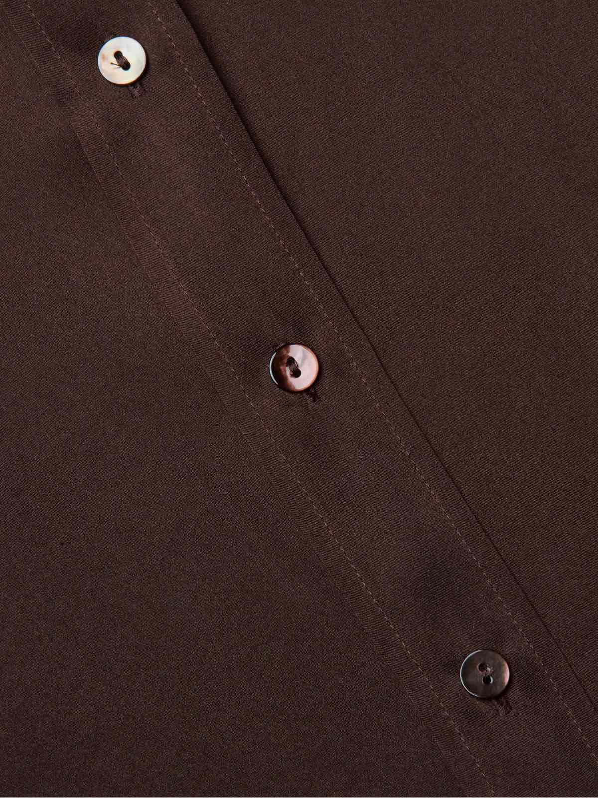 Introducing the classic silk button-down essential for every closet. The L'Agence signature Dani blouse, with its elegant three-quarter sleeves, returns in a rich coffee bean brown.