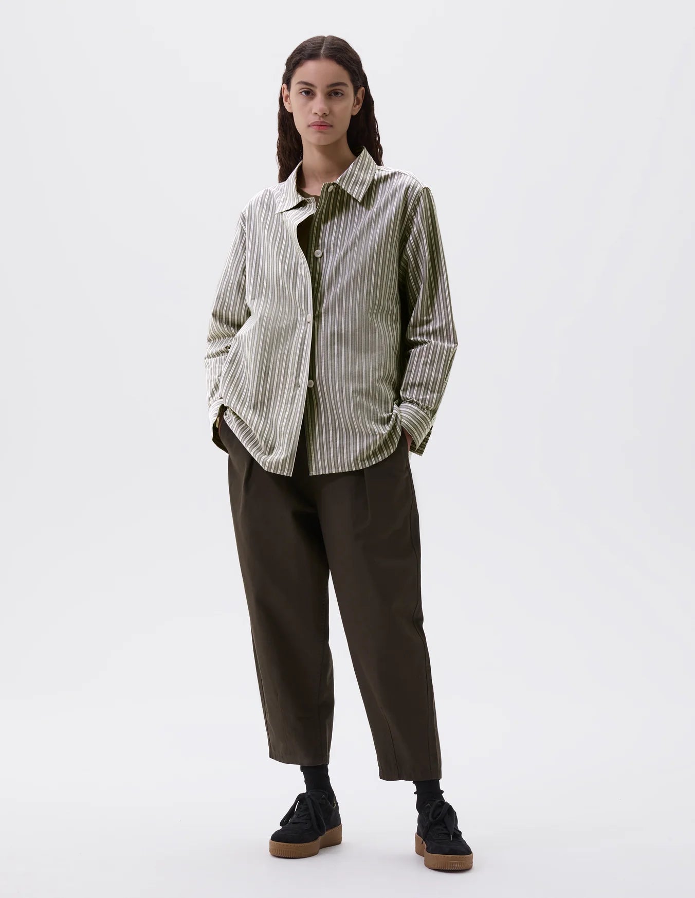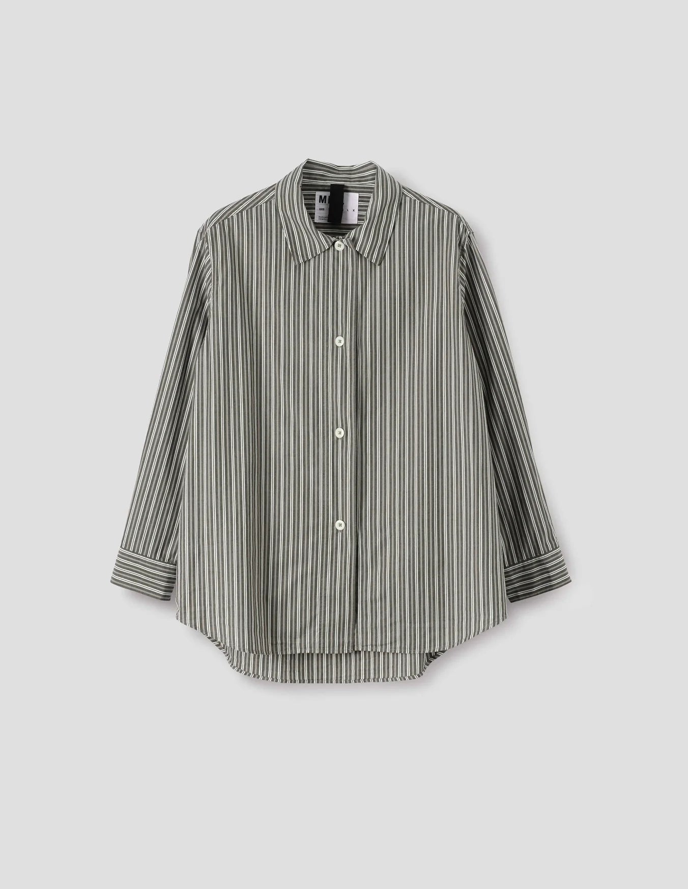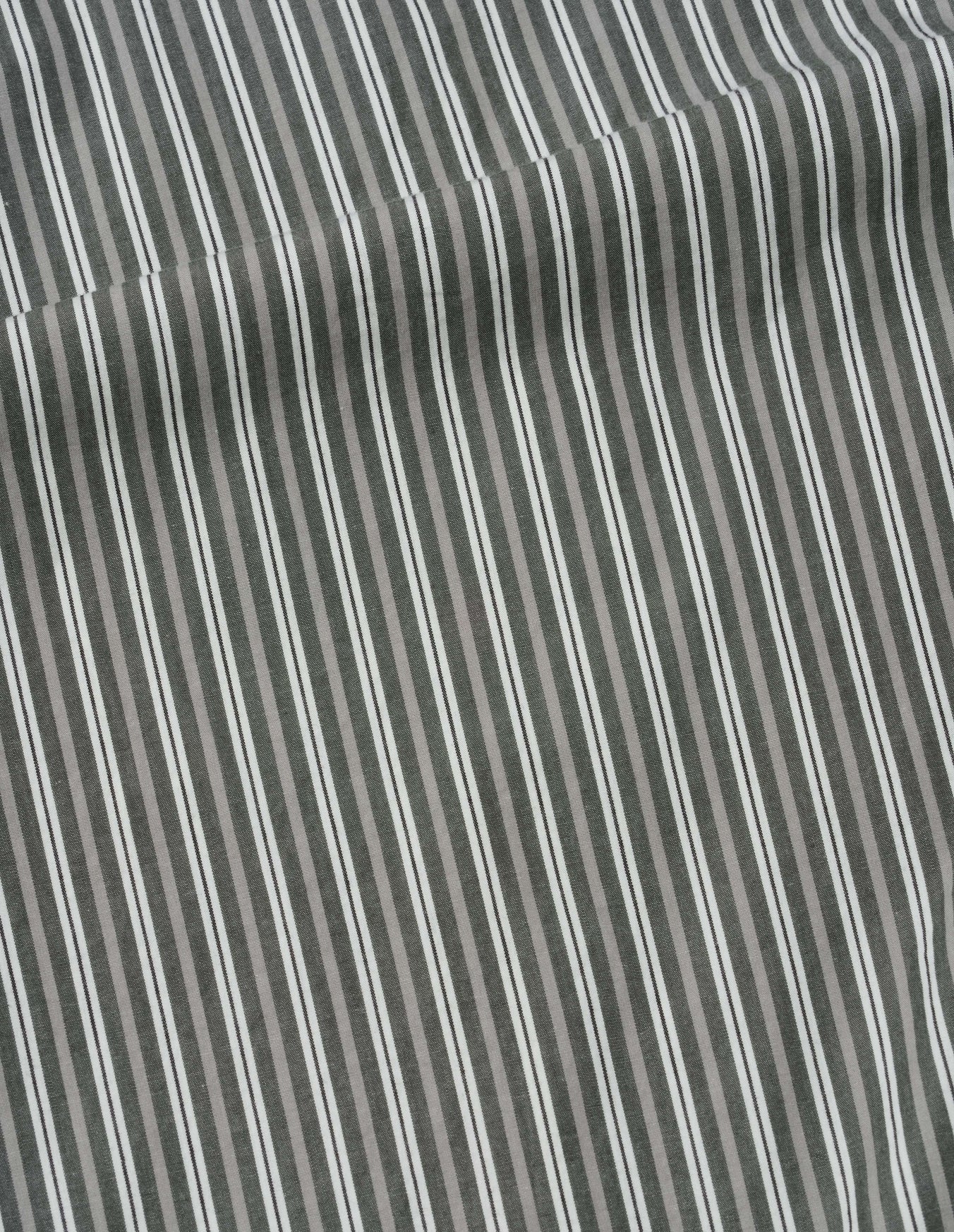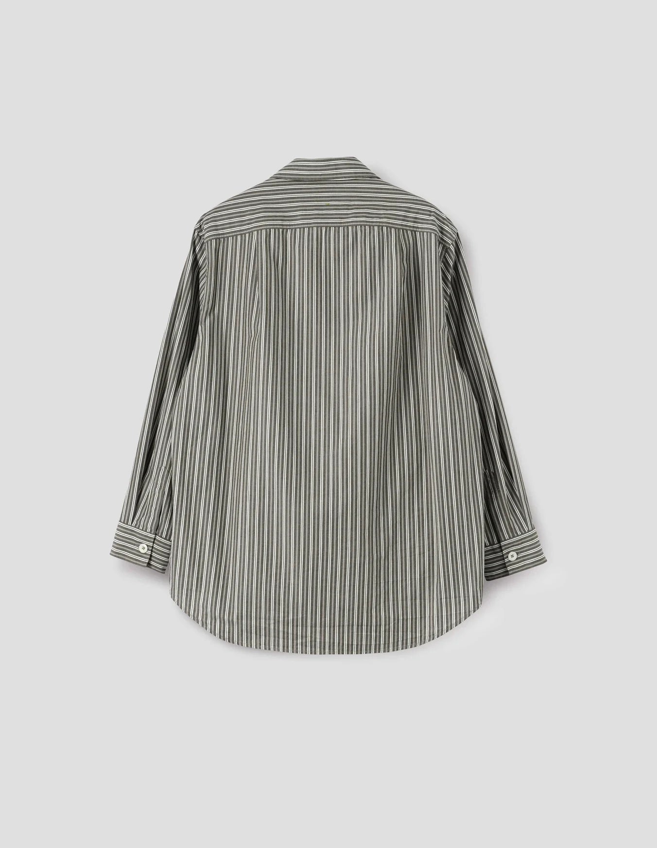 The MHL. Longline Shirt epitomises understated elegance with its thoughtfully extended silhouette and relaxed proportions. Crafted from dense cotton plain weave, this piece features a distinctive dry hand feel that develops character with wear. The sophisticated two-tone stripe in forest, grey, and off-white creates a versatile foundation for considered dressing. Designed with meticulous attention to detail, the shirt showcases a wide stitch-through placket and a pleated back yoke that allows for ease of movement. The elongated hem provides contemporary coverage, while the minimalist aesthetic ensures this piece transcends seasonal trends. Colours have been developed exclusively for MHL., reflecting the brand's commitment to refined, purposeful design. An investment piece that rewards careful styling and enduring wear.