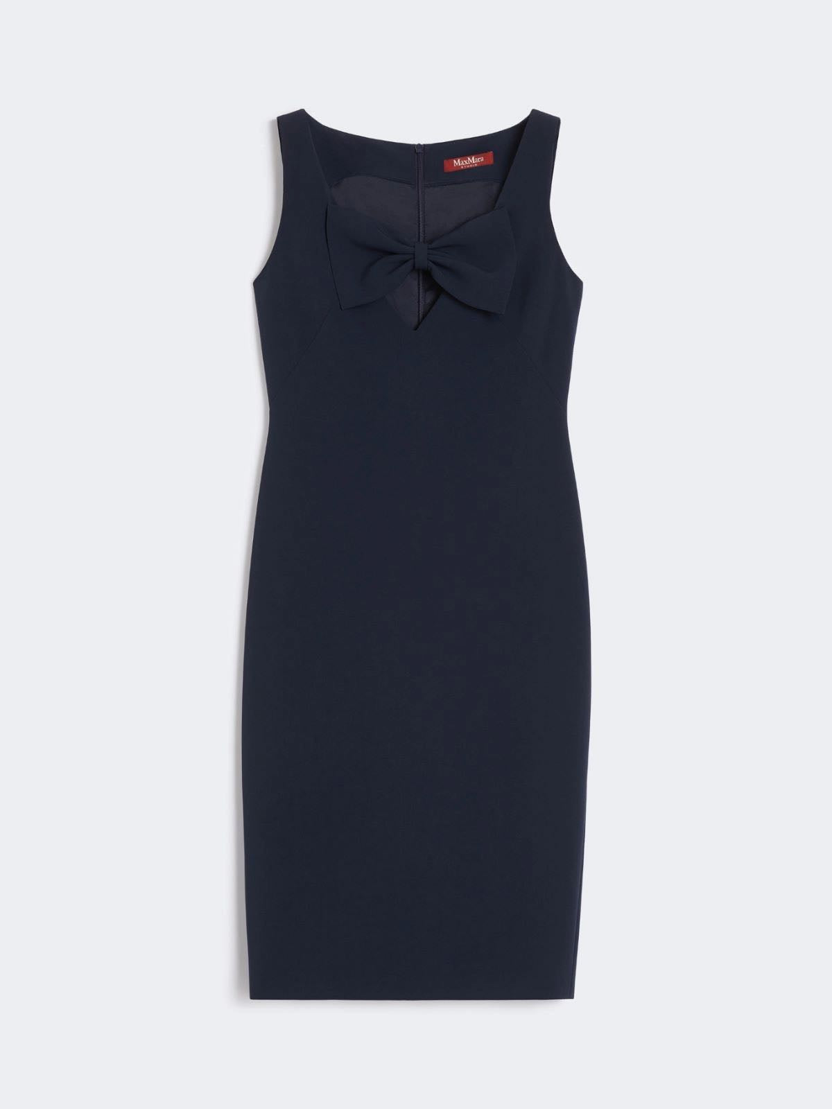 Crafted from luxurious cady fabric, this Maxmara Studio midi dress epitomises refined elegance with its plunging V-neckline and signature couture bow detail.