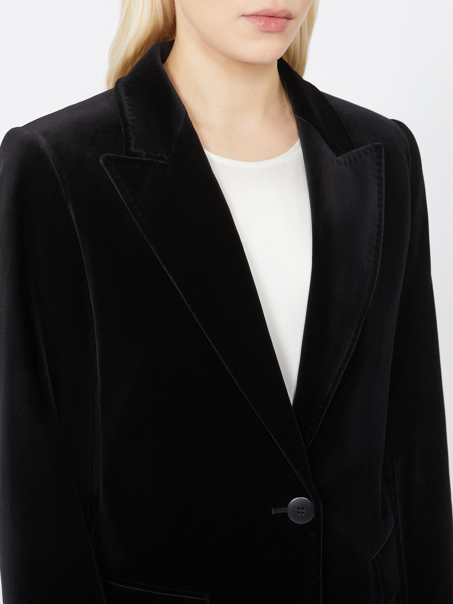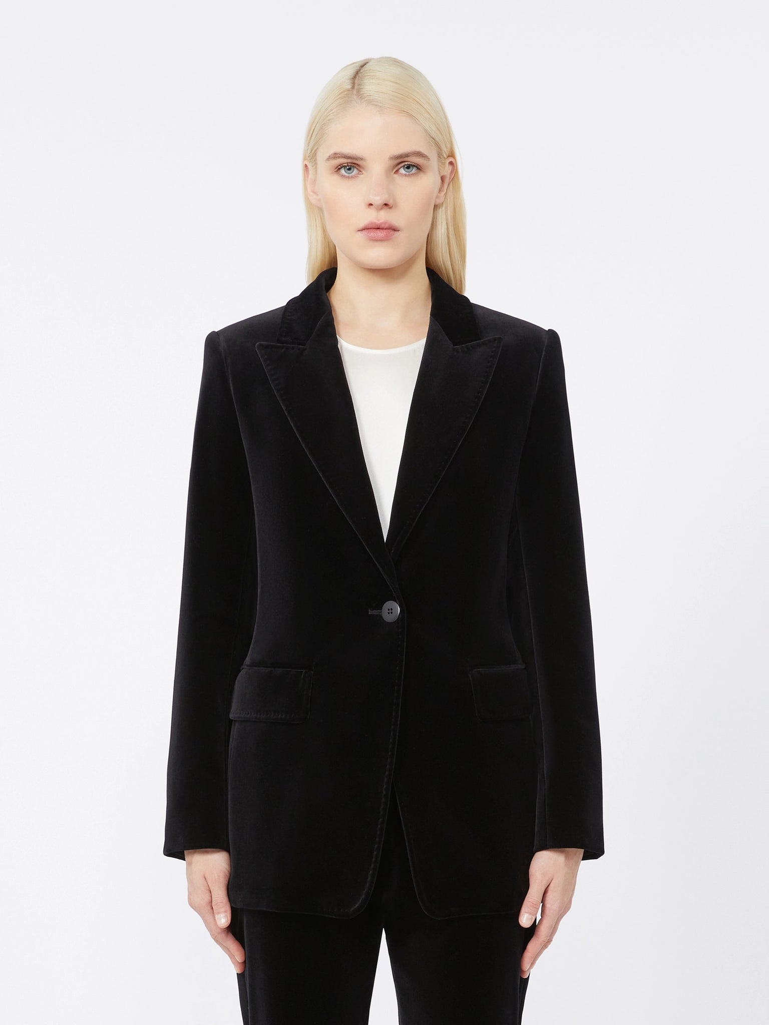 This MaxMara Studio blazer offers a refined balance of classic sophistication and contemporary style. Its smooth velvet finish adds a luxurious feel, while the tailored silhouette highlights a flattering and well-balanced shape.