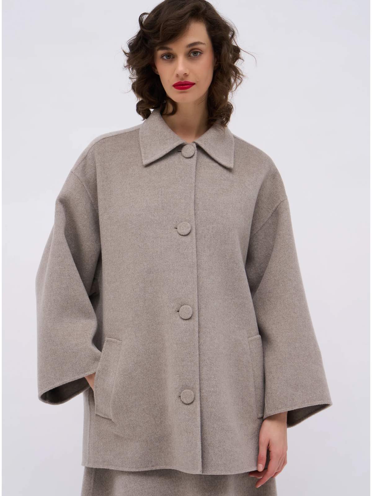 Designed with an oversized silhouette, it offers a relaxed yet elegant fit that can effortlessly elevate any wardrobe. Two raglan pockets on the front provide practical storage while maintaining a sleek appearance. The coat features a simple crossover front, discreetly fastened with covered buttons, lending a minimalist and refined touch to the overall design. Ideal for sophisticated layering during colder months, this coat balances comfort and style with ease.