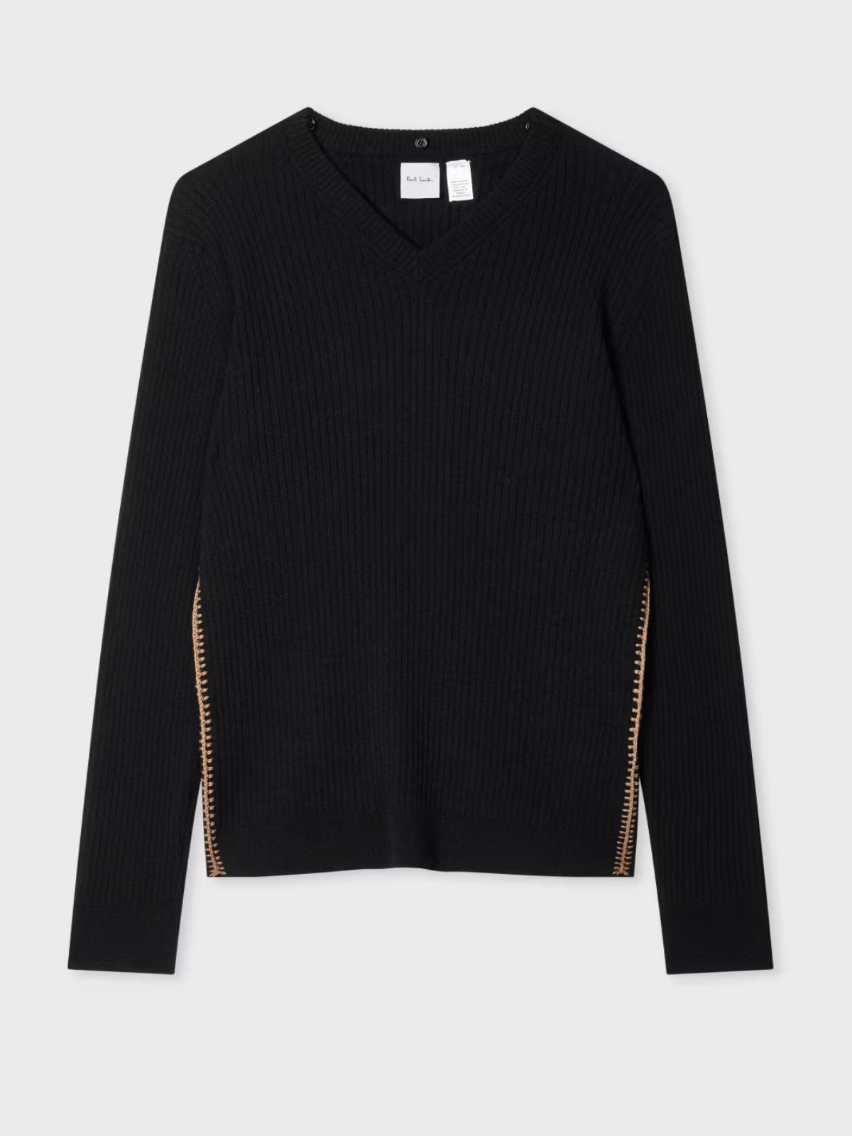This Paul Smith sweater combines refined elegance with understated practicality. Crafted from a luxuriously soft wool-cotton blend, it showcases a distinctive detachable collar with button fastening and a flattering V-neckline that creates an effortlessly relaxed aesthetic. The signature brown blanket stitching detailing along the seams adds a touch of designer sophistication. Equally at home in professional or leisure settings, this versatile piece seamlessly transitions between occasions with timeless style.