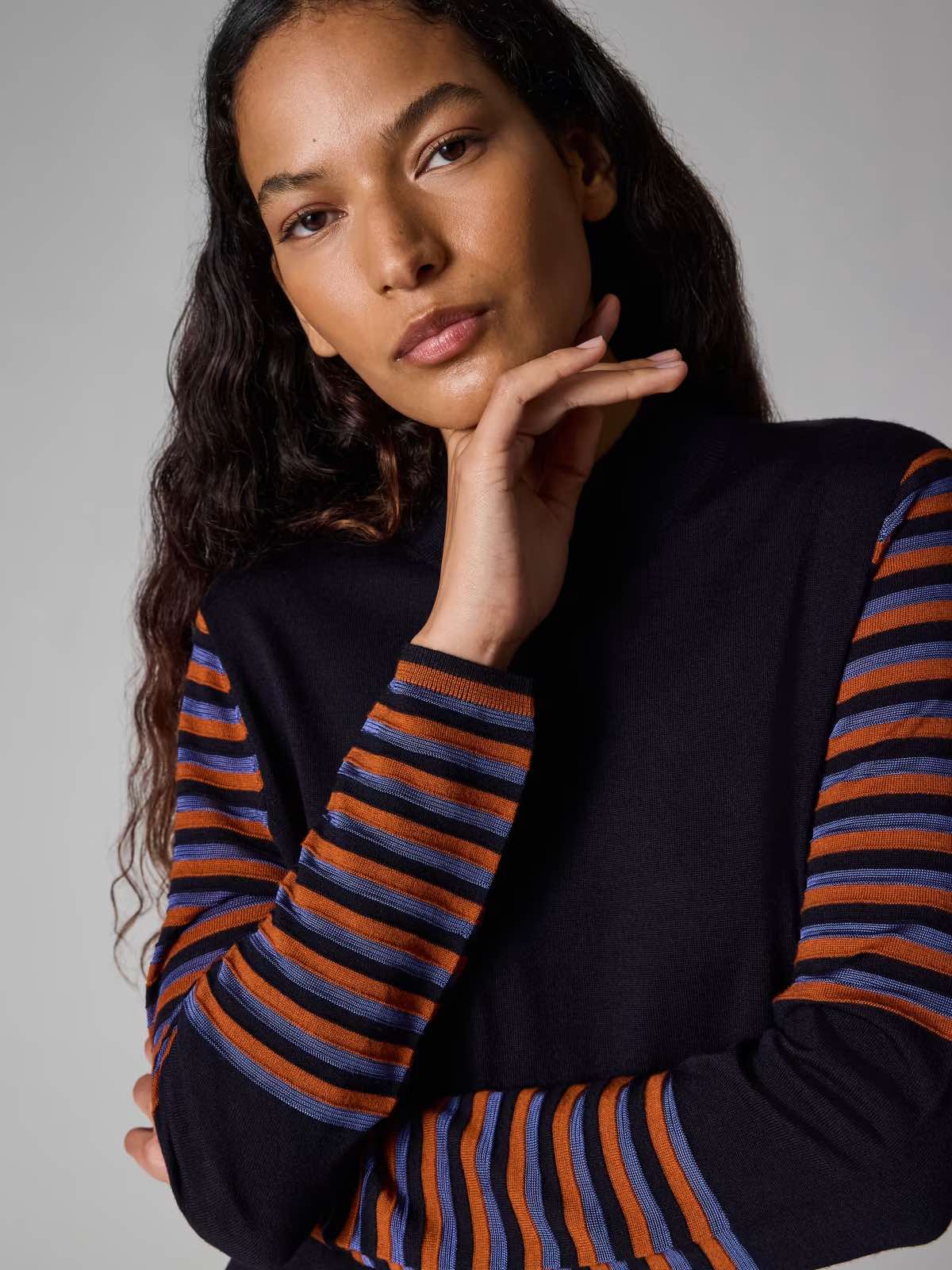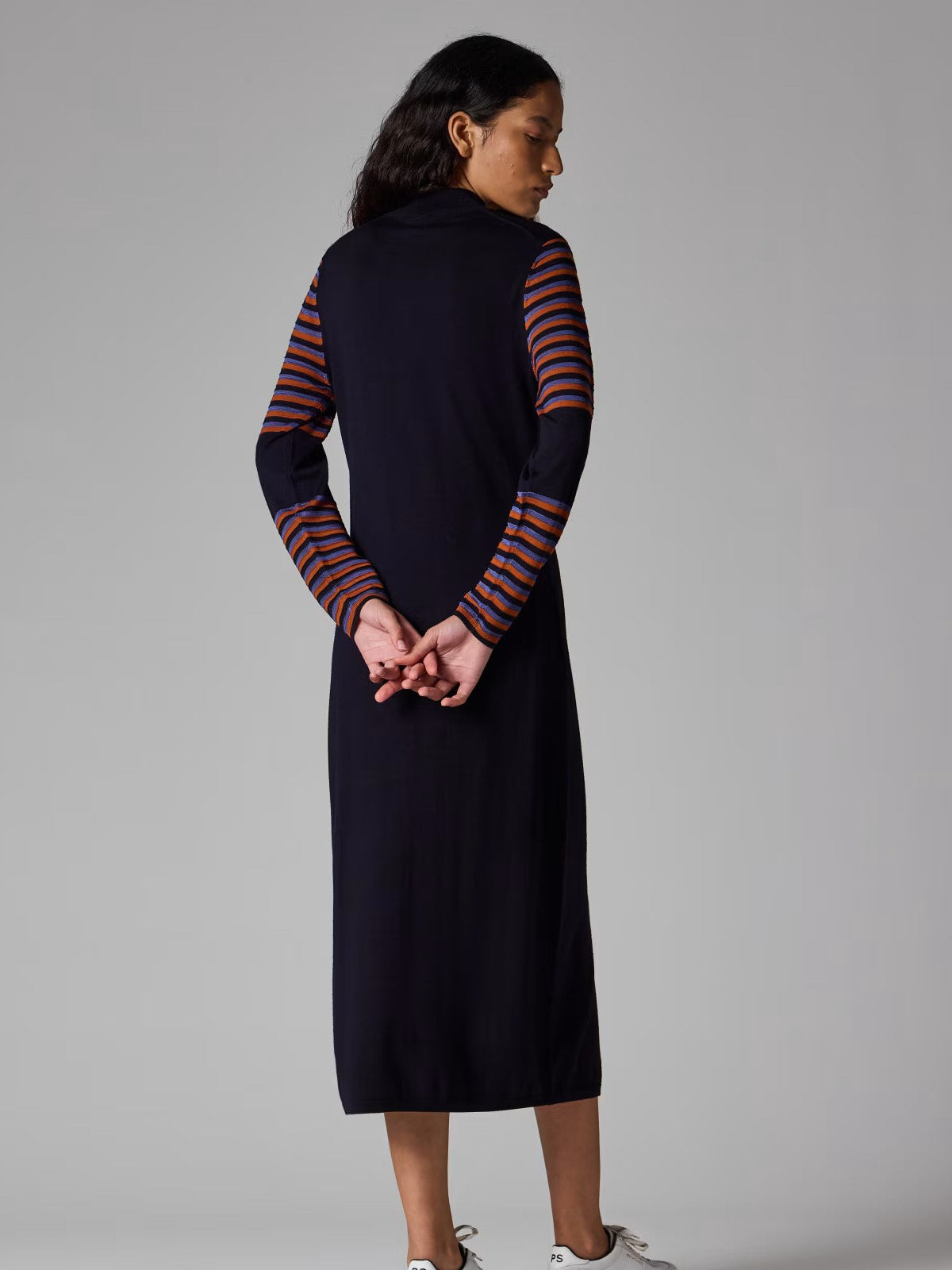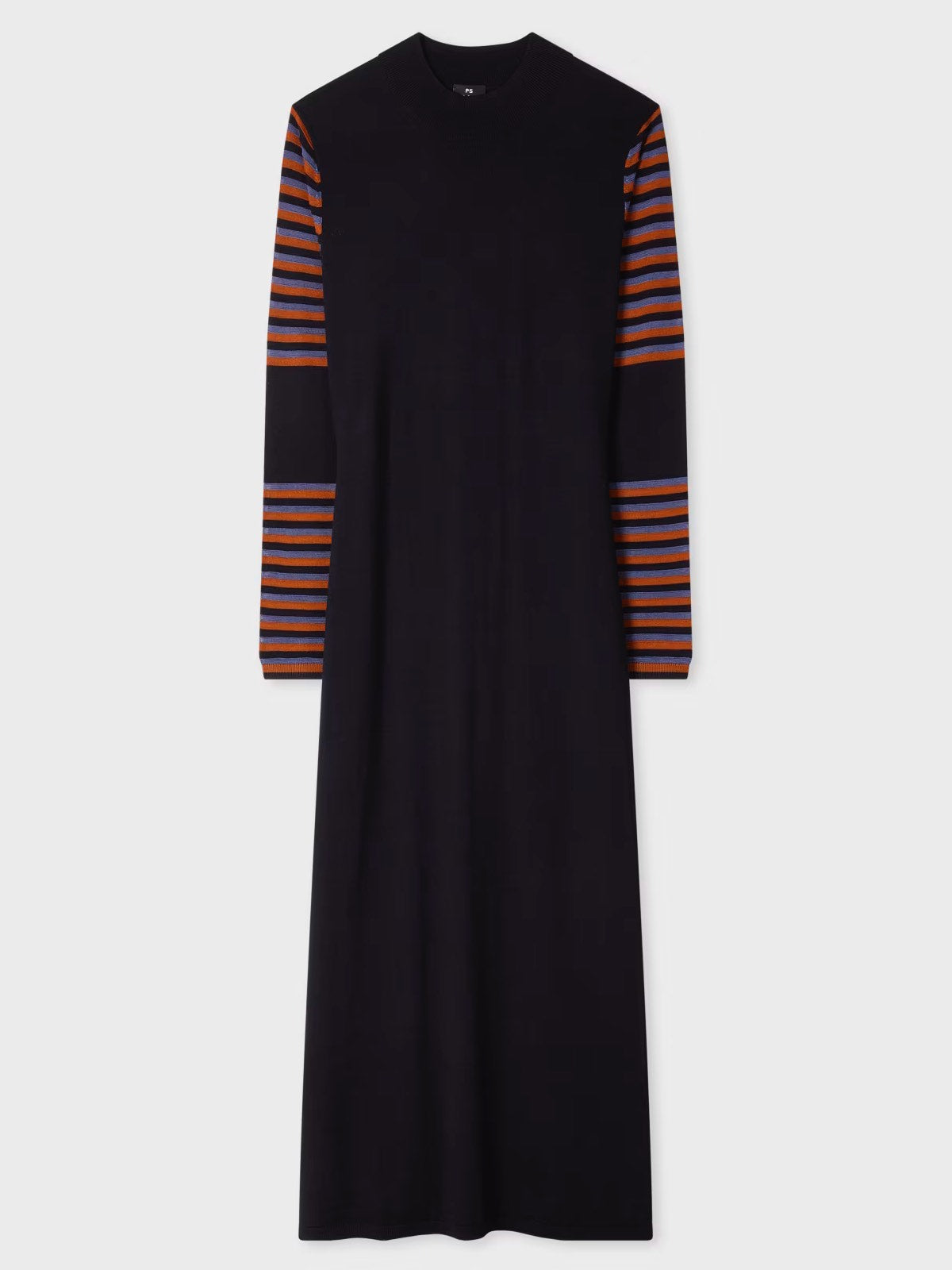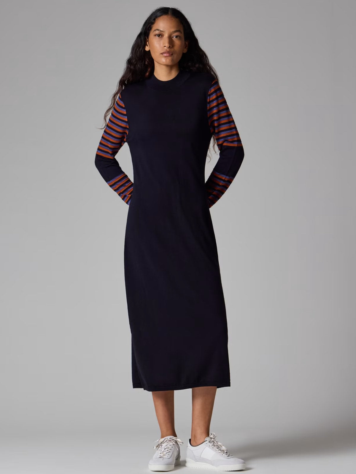 The contrasting striped sleeves add a distinctive, sophisticated flair, while ribbed trims enhance its elegant silhouette. Perfectly designed for transitional seasons, this dress effortlessly balances warmth with breathability. Its versatile design makes it an ideal choice for refined everyday wear—pair it with ankle boots to elevate your look with subtle yet striking detail. This piece seamlessly combines classic tailoring with contemporary accents for timeless appeal.