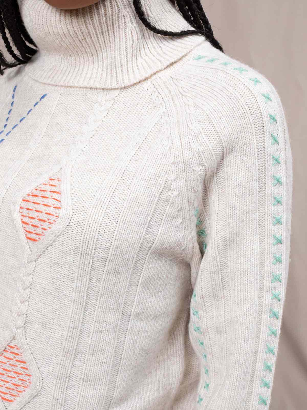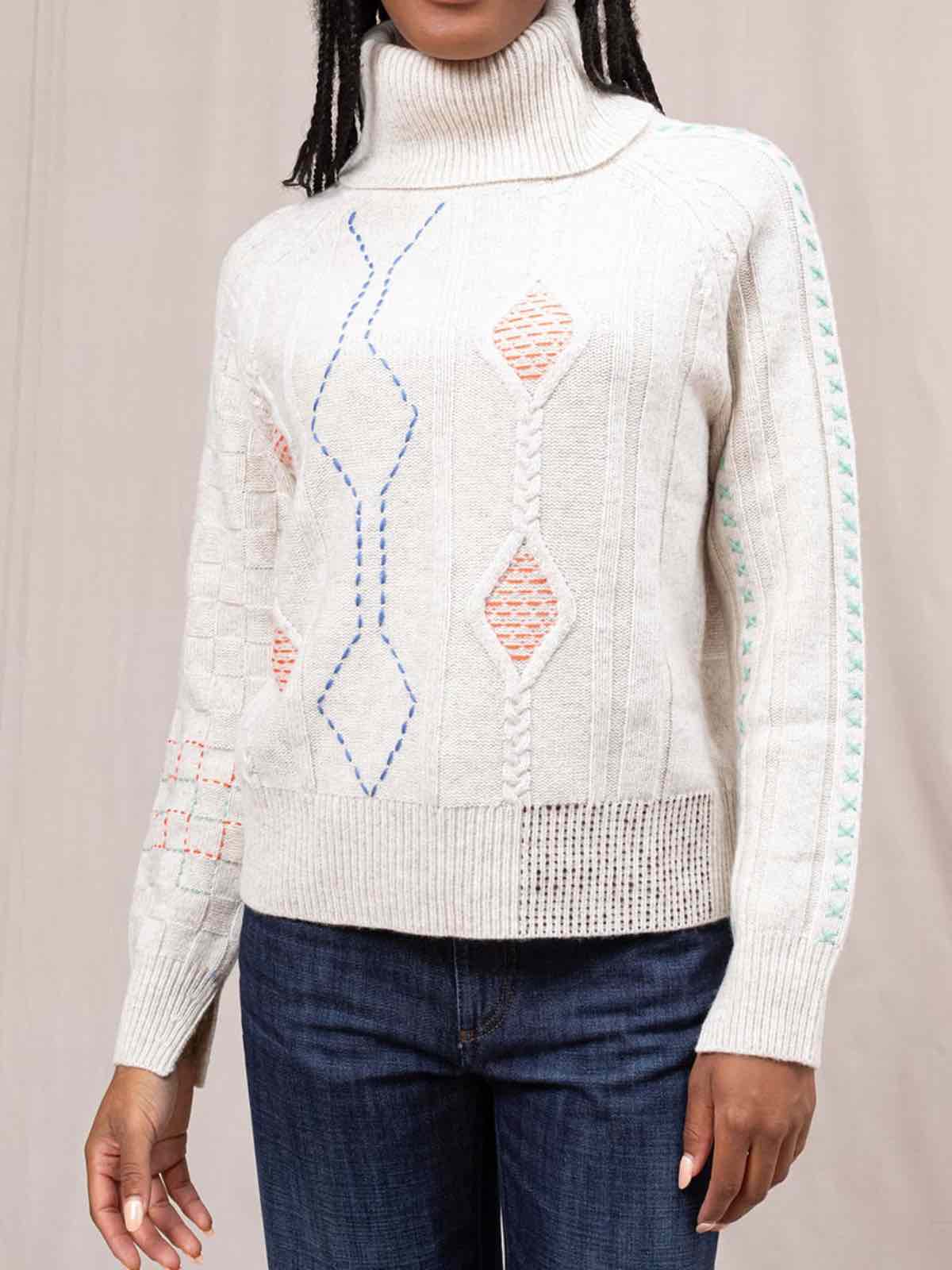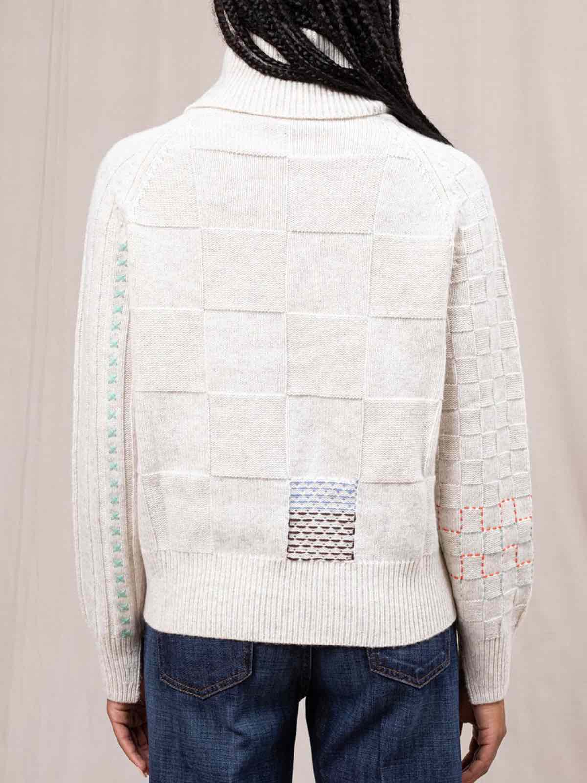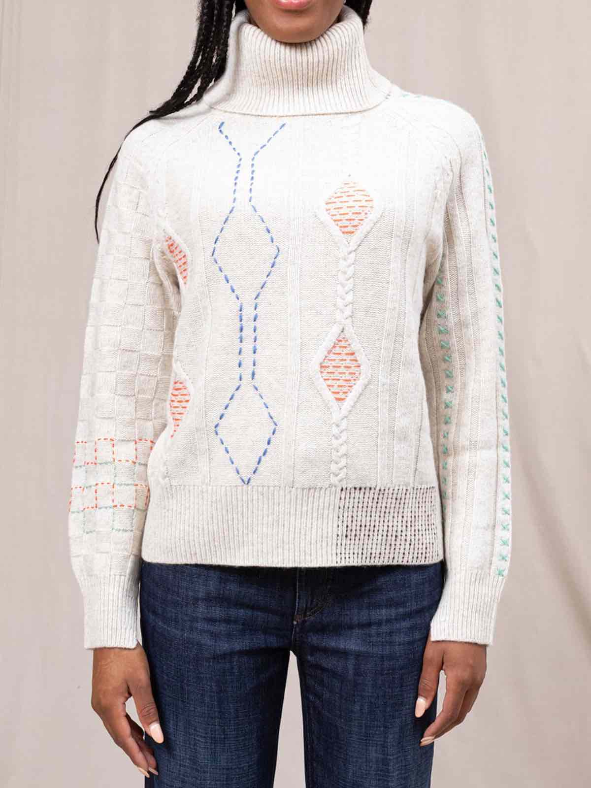 Crafted from a luxurious wool-blend, this Paul Smith cream jumpern showcases intricate embroidered patchwork detailing that brings an elegant yet playful dimension to its classic design.