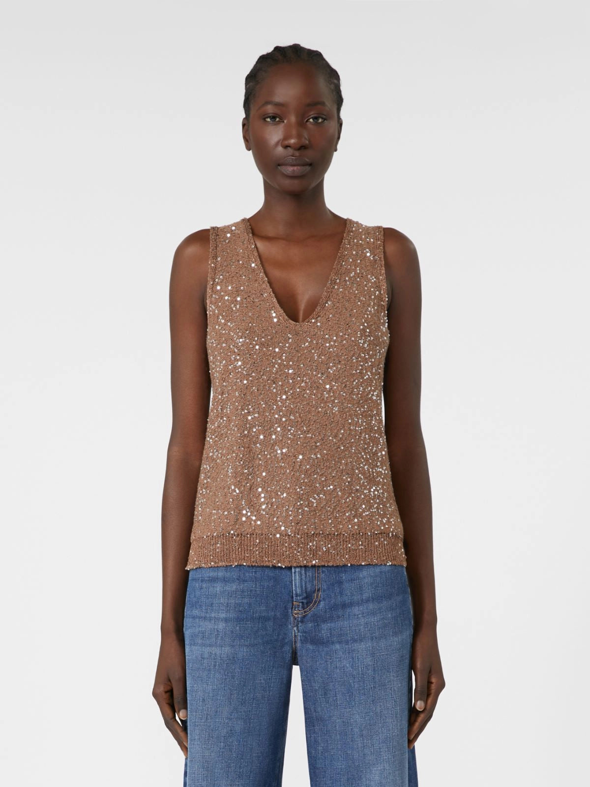 Elevate your wardrobe with this exquisite Weekend by Maxmara sleeveless top, a masterpiece of refined elegance. Crafted from a luxurious cotton-blend yarn, this piece showcases stunning all-over sequin embroidery that catches the light beautifully, making it perfect for both special occasions and elevated everyday wear. The top features a flattering V-neck front and relaxed silhouette that drapes gracefully on the body, offering both comfort and sophistication. Finished with refined rib-knit trim detailing, it provides structure and a polished edge. The rich marron glacè hue adds depth and versatility to your collection, pairing effortlessly with tailored trousers, elegant skirts, or layered under structured blazers. A timeless investment piece that embodies contemporary luxury.
